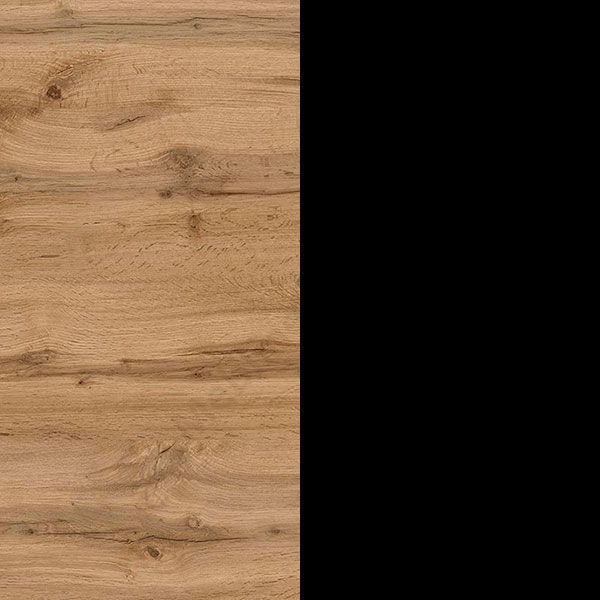 Корпус виконаний з ламінованої ДСП деревного кольору Дуб Тахо з контрастними рамками фасаду чорного кольору.