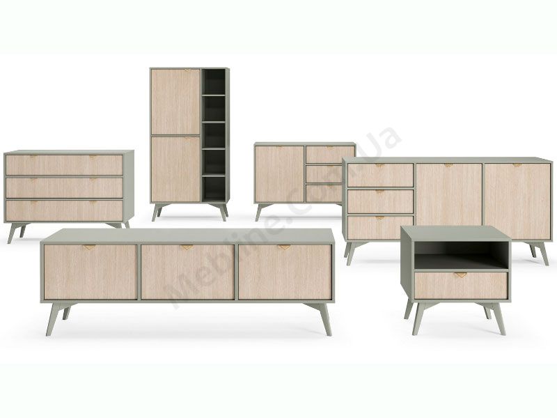 В асортимент колекції входять необхідні меблі для облаштування вітальні — комоди та тумби різних модифікацій, а також шафа-стелаж.
