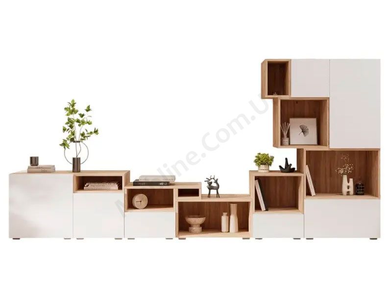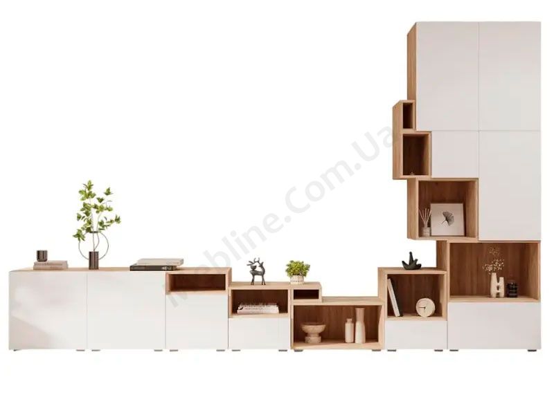 Система меблів Голд дозволяє зібрати стінку для вітальні з тих елементів, які вам до вподоби. Велика кількість різних тумб та стелажів з легкістю поєднуються у будь-які конфігурації.