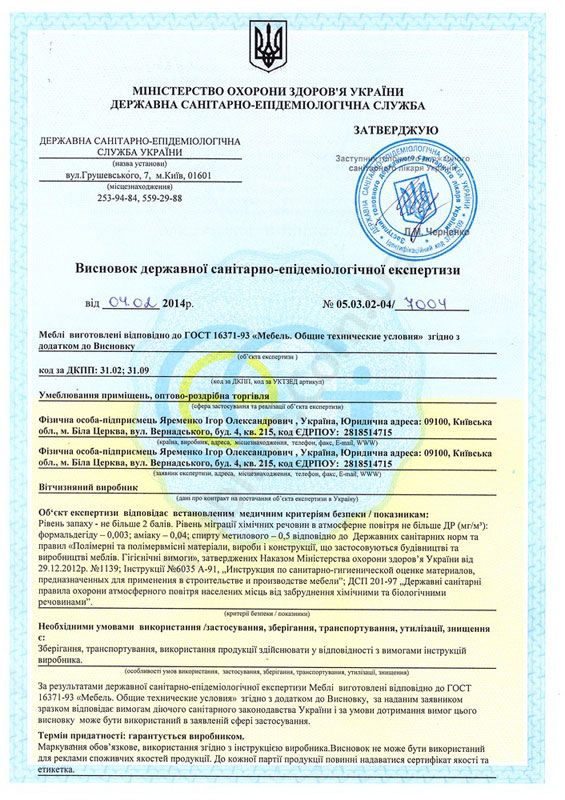 Кухні МЕБЛІ СТАР мають необхідний санітарно-гігієнічний висновок.