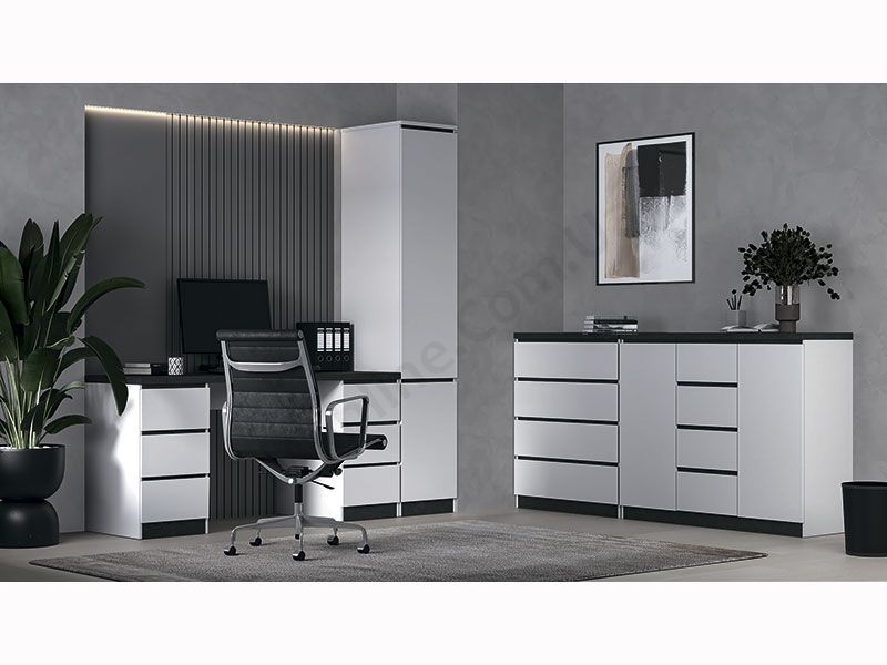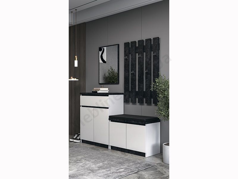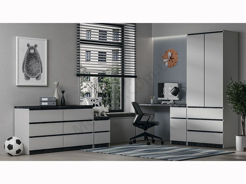 Меблі виконуються з високоякісної ДСП, завтовшки 16 та 18 мм у комбінації кольорів фасаду та корпусу, кришка комодів та тумб посилена, завтовшки 34 мм. Замість стандартних ручок фасад має зріз під кутом, що підкреслює мінімалістичний дизайн. Шухляди на телескопічних напрямних повного висування, тумба доповнена м’яким сидінням з еко-шкіри. Задня стінка виготовляється з ДВП білого кольору.