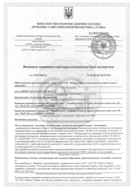 Крісла та крісла Новий Стиль мають відповідні санітарно-епідеміологічні висновки, а також сертифікати відповідності встановленого зразка.