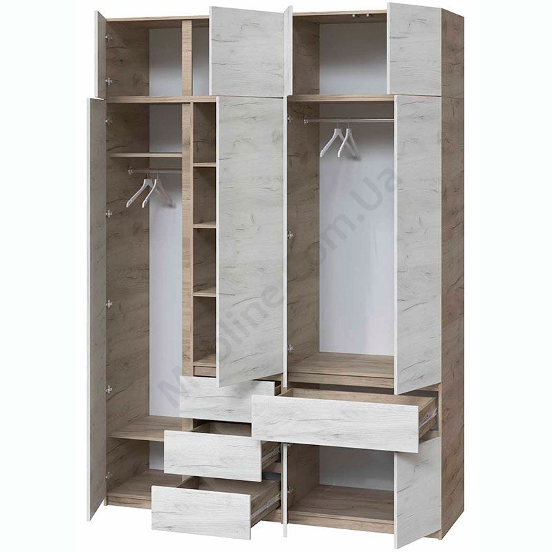 Чотиристулкова шафа з висувними шухлядами та антресоллю.