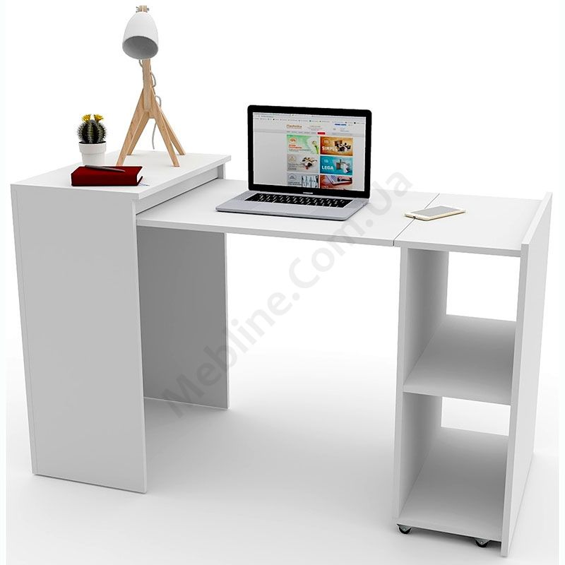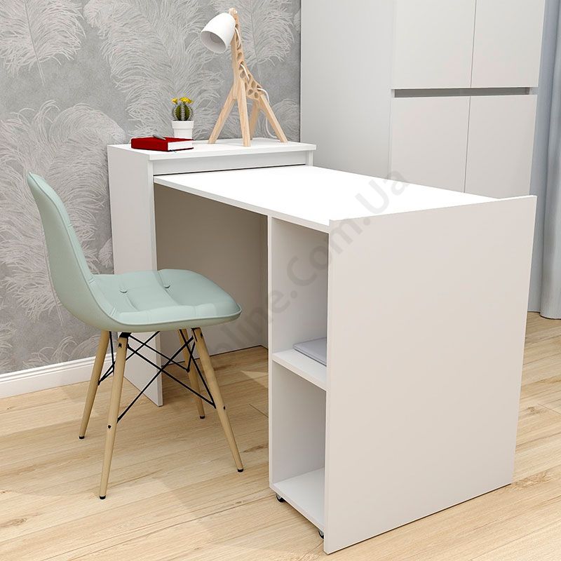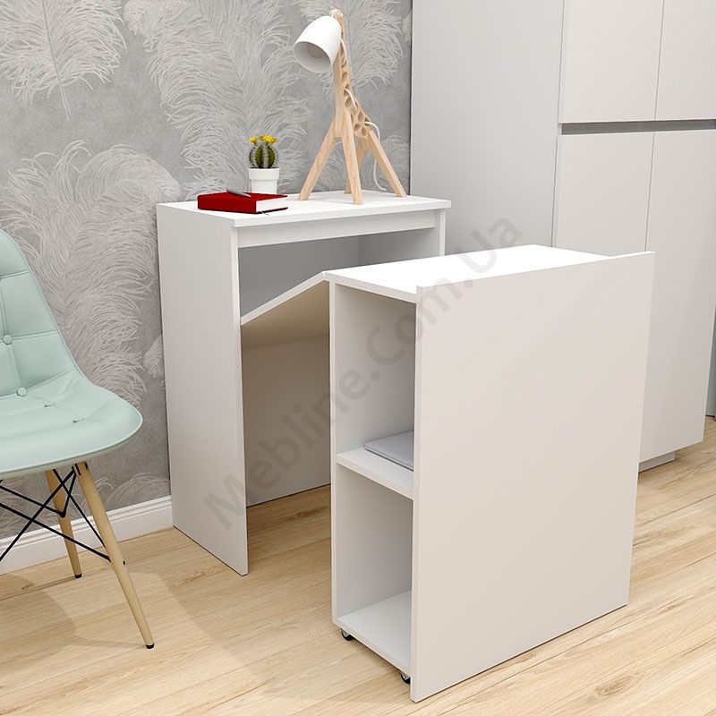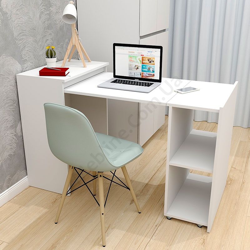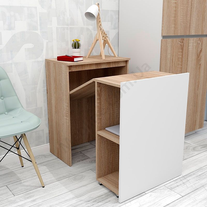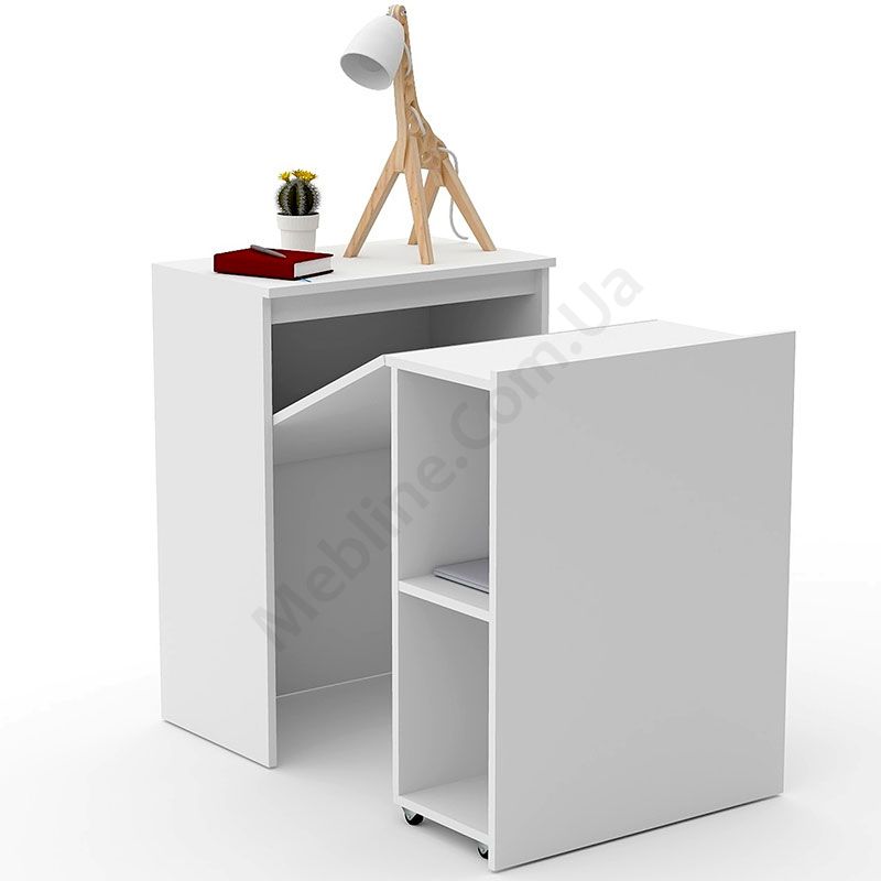 Ламінована ДСП Swiss Krono, завтовшки 16 мм.Екологічна безпека класу Е-1.Фурнітура "DC", "Linken".Протиударна крайка стільниці — ПВХ, завтовшки 1 мм.Протиударна кромка корпусу — ПВХ, завтовшки 0, 5 мм.В складеному вигляді має зовнішність тумби.Розкладається у комп’ютерний стіл.Має відкриті полиці.