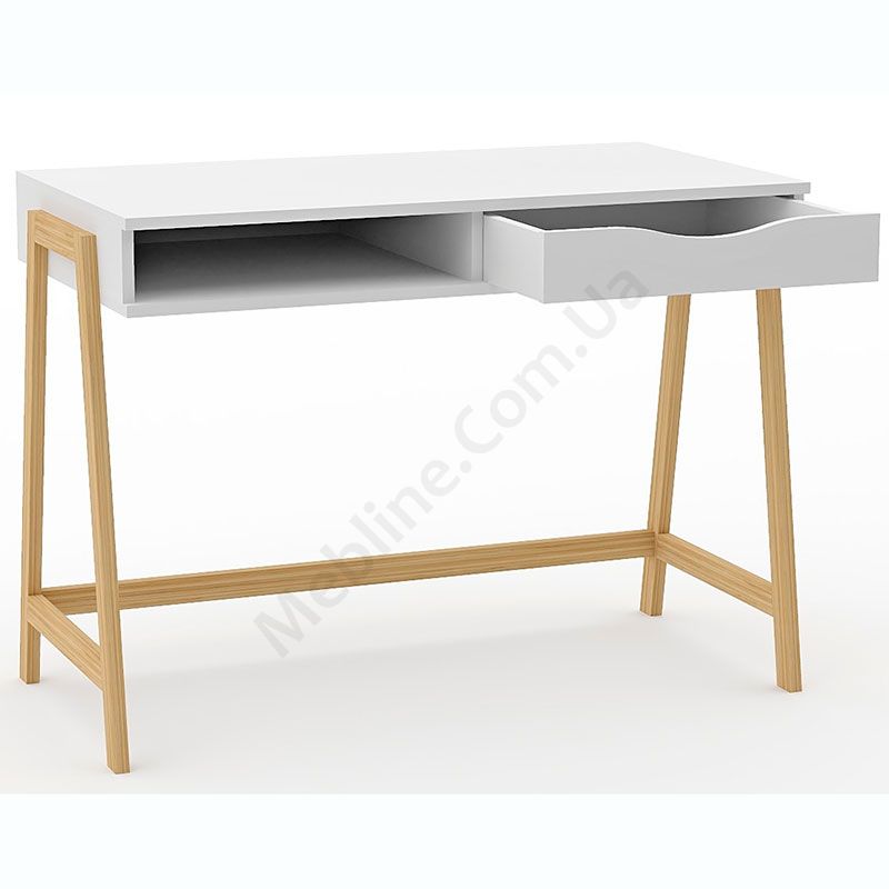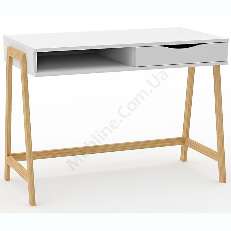Стільниця виконана з ламінованої ДСП Swiss Krono, завтовшки 16 мм.ДСП має високу щільність, екологічна безпека класу Е1.Ніжки виготовлені з натурального дерева ясена.Протиударна крайка ПВХ, завтовшки 0,5 мм.Під стільницею відкрита полиця та висувна шухляда.Шухляда без напрямних.Замість ручок виріз у фасаді.Підійде для приміщень у сучасному стилі.