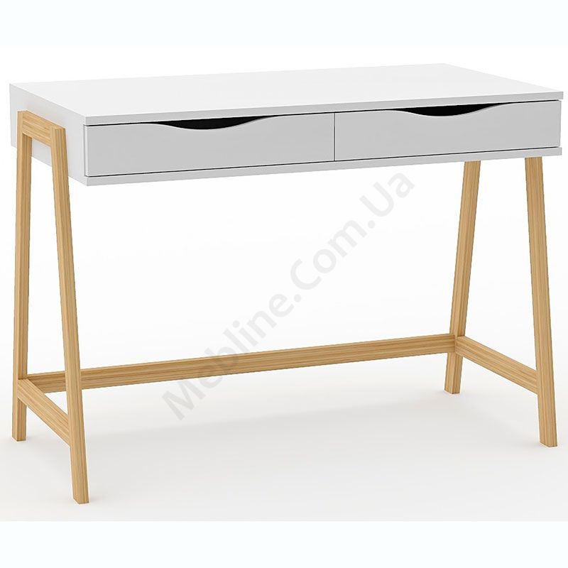 Стільниця виконана з ламінованої ДСП Swiss Krono, завтовшки 16 мм.ДСП має високу щільність, екологічна безпека класу Е1.Ніжки виготовлені з натурального дерева ясена.Протиударна крайка ПВХ, завтовшки 0,5 мм.Під стільницею дві висувні шухляди.Шухляди без напрямних.Замість ручок вирізи у фасадах.Підійде для приміщень у сучасному стилі.