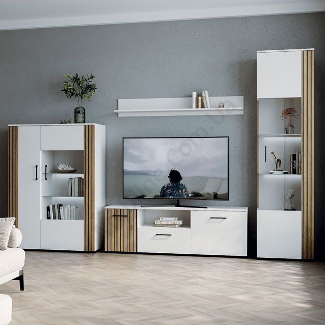 Стінка у вітальню з тумбою, вітринами та поличкою.