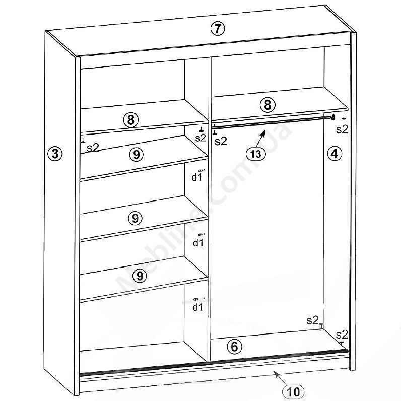 - Задня стінка — ДВП, завтовшки 3 мм білого кольору.