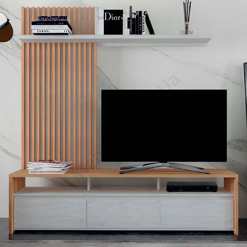 - Тумба під телевізор з трьома відкидними дверцятами та відкритими секціями.