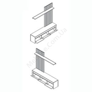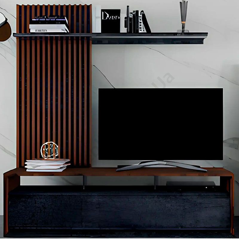 - Тумба під телевізор з трьома відкидними дверцятами та відкритими секціями.