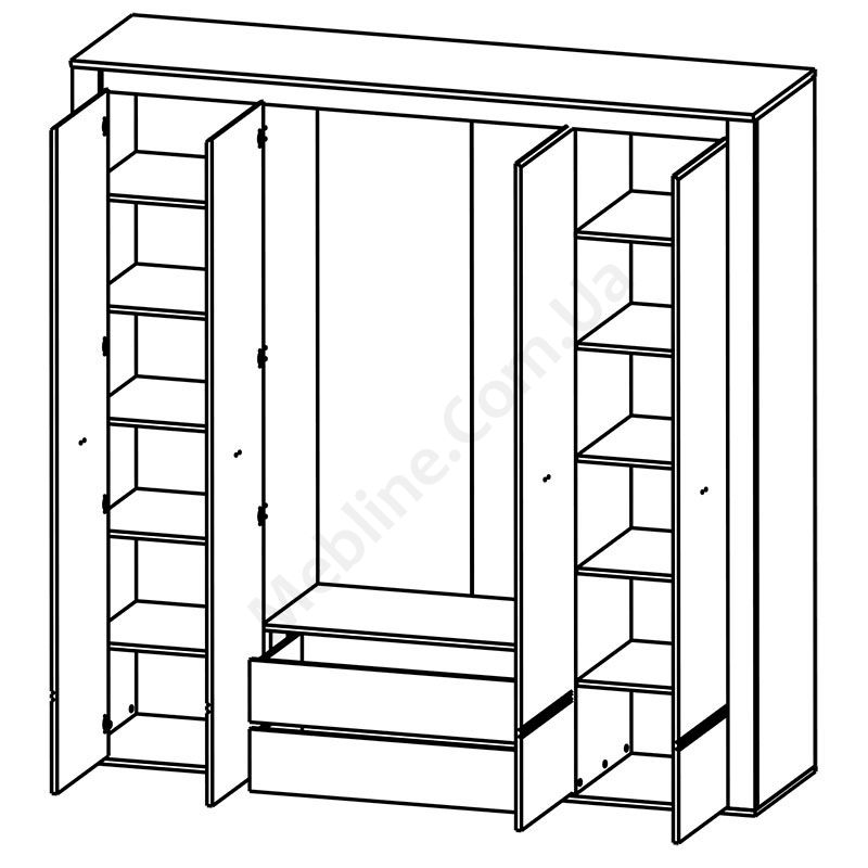 Чотиридверна шафа з висувними шухлядами, штангою та полицями.