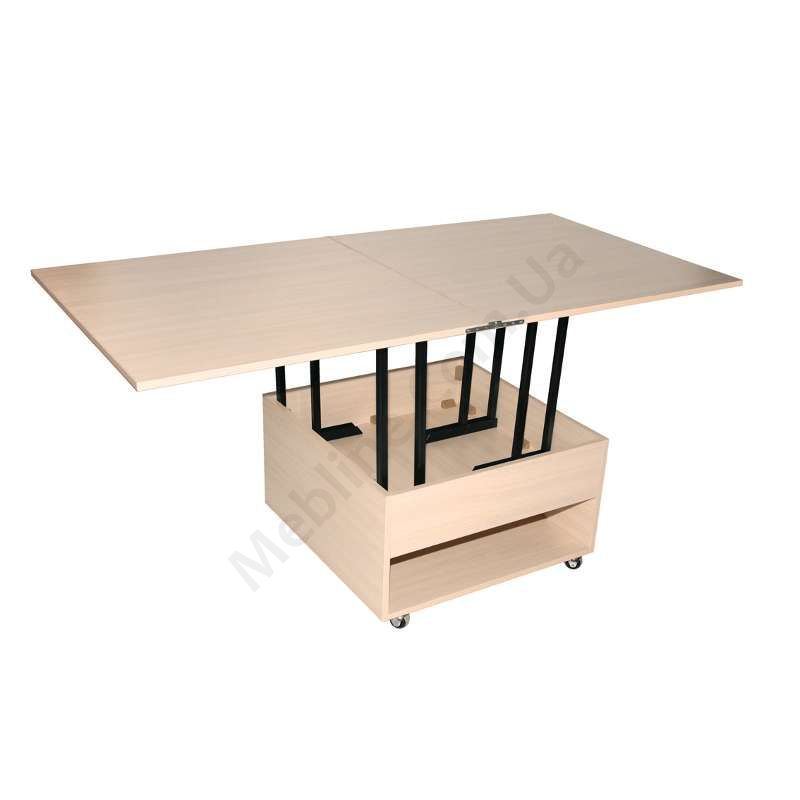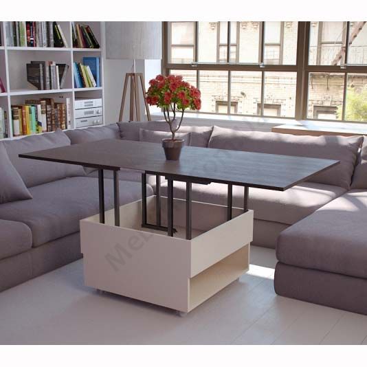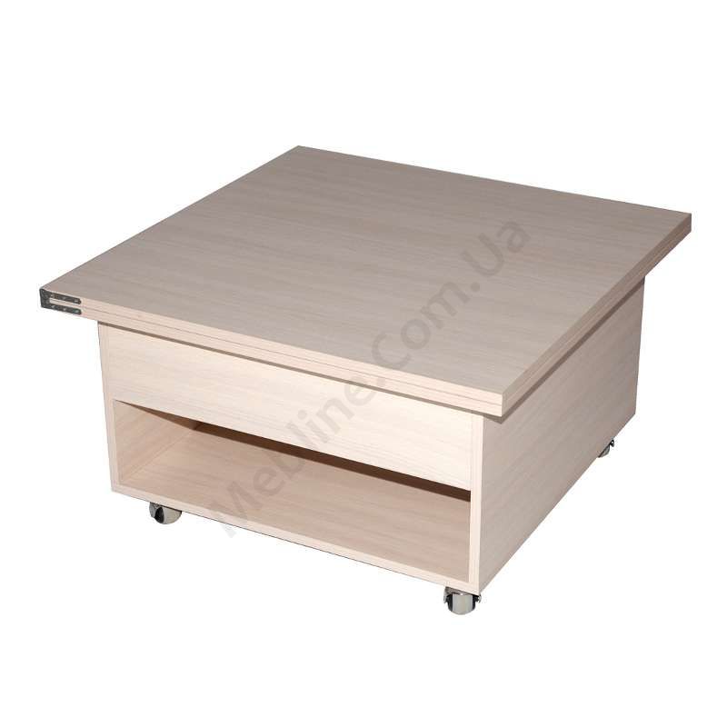 Квадратний стіл-трансформер з розсувною та підйомною стільницею та відкритою полицею.