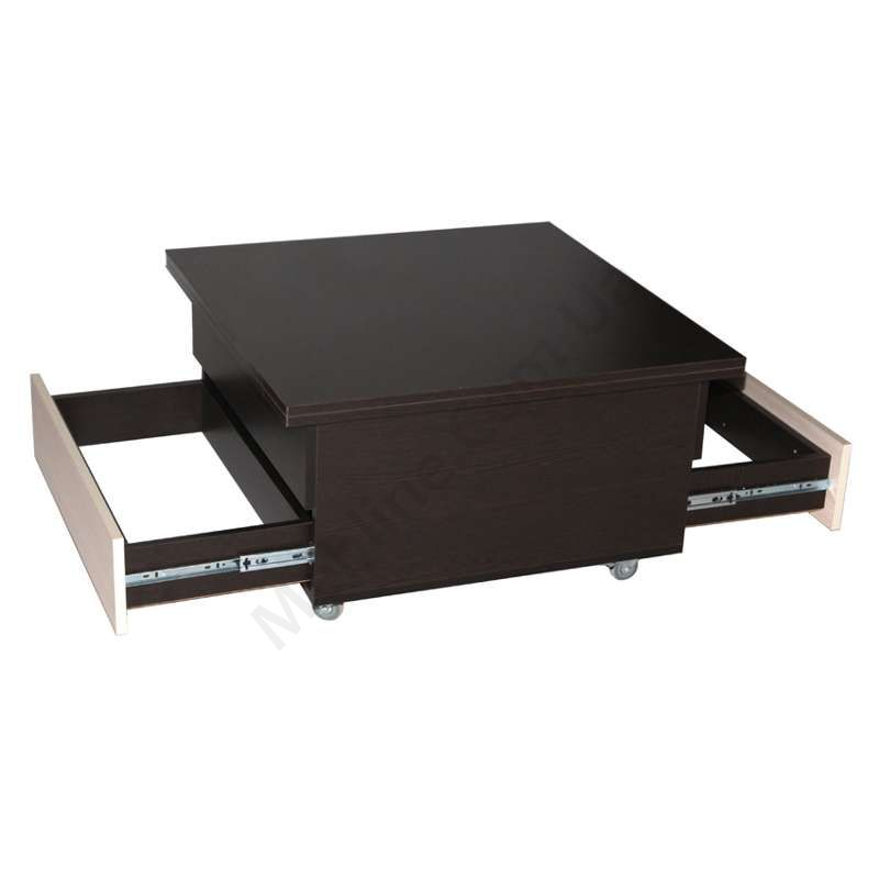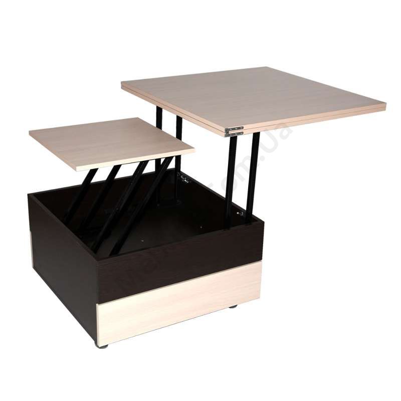 Квадратний стіл-трансформер з розсувною та підйомною стільницею та висувними шухлядами.