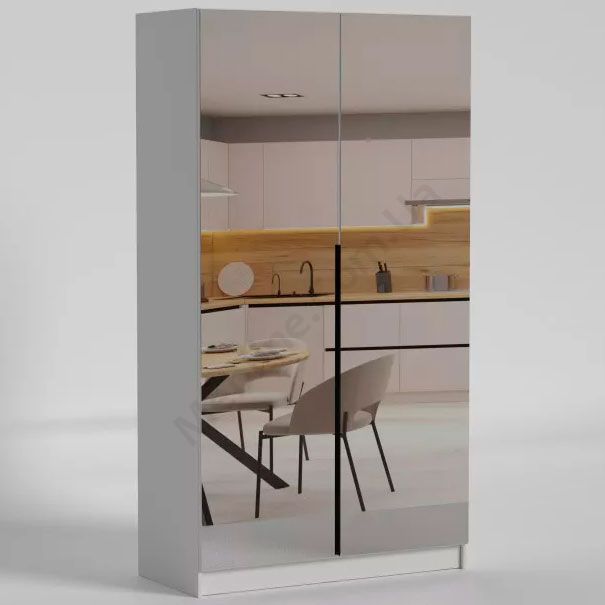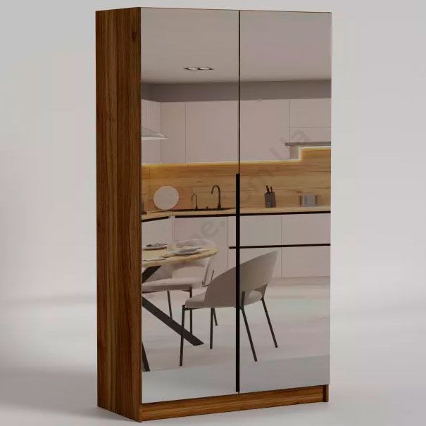 Дводверна шафа з дзеркальними дверцятами, штангою для одягу та полицями.
