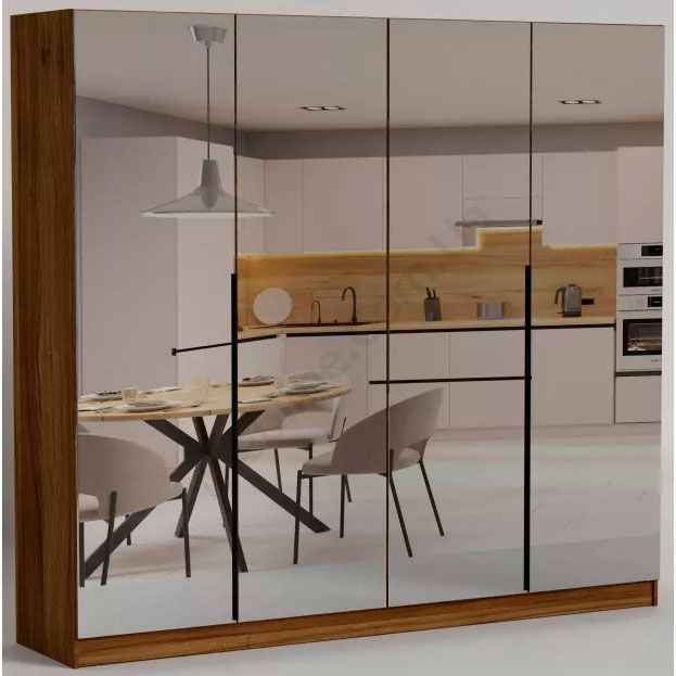 Чотиридверна шафа з дзеркальними дверцятами, штангою для одягу та полицями.