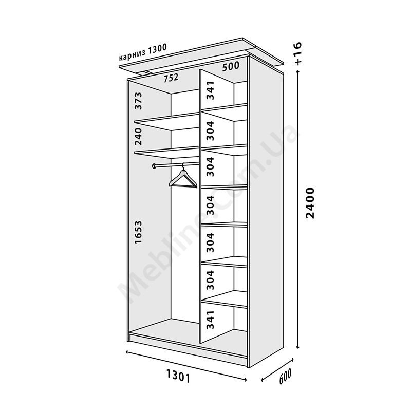Дводверна шафа-купе шириною 130 см, глибиною 60 см, висотою 220 чи 240 см