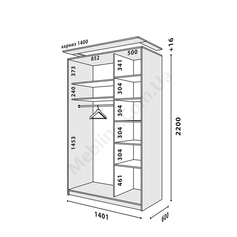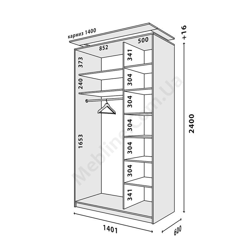 Дводверна шафа-купе шириною 140 см, глибиною 60 см, висотою 220 чи 240 см