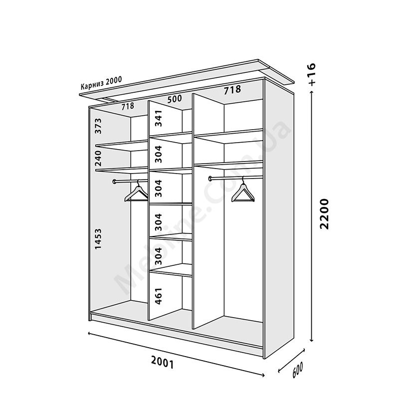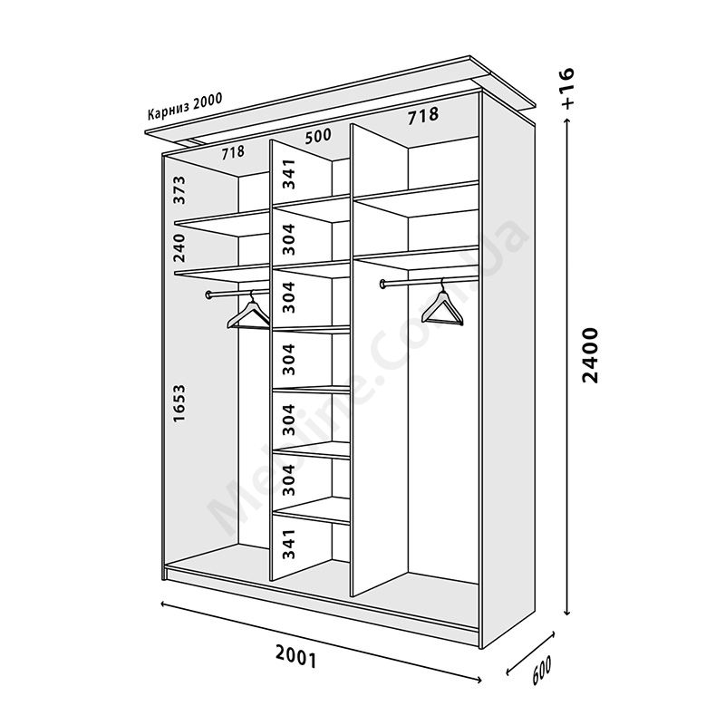 Тридверна шафа-купе шириною 200 см, глибиною 60 см, висотою 220 чи 240 см