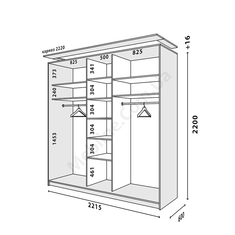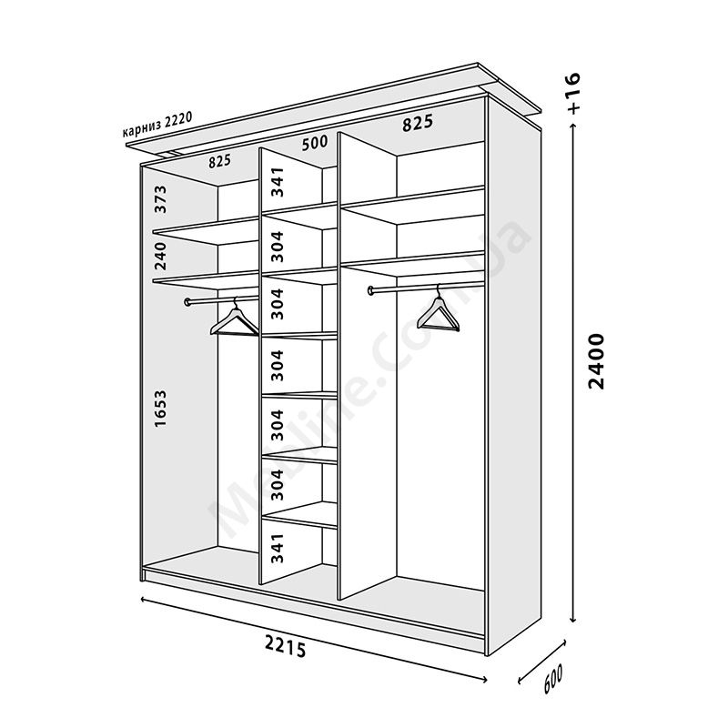 Тридверна шафа-купе шириною 222 см, глибиною 60 см, висотою 220 чи 240 см