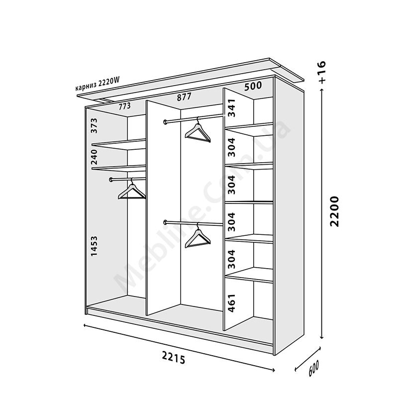Тридверна шафа-купе шириною 222 см, глибиною 60 см, висотою 220 чи 240 см
