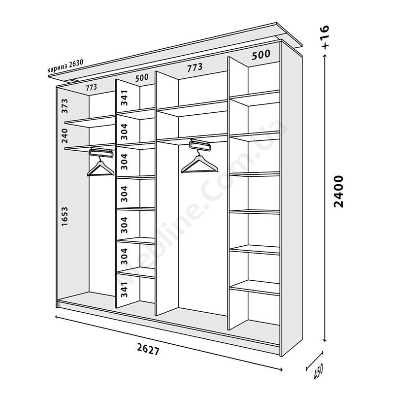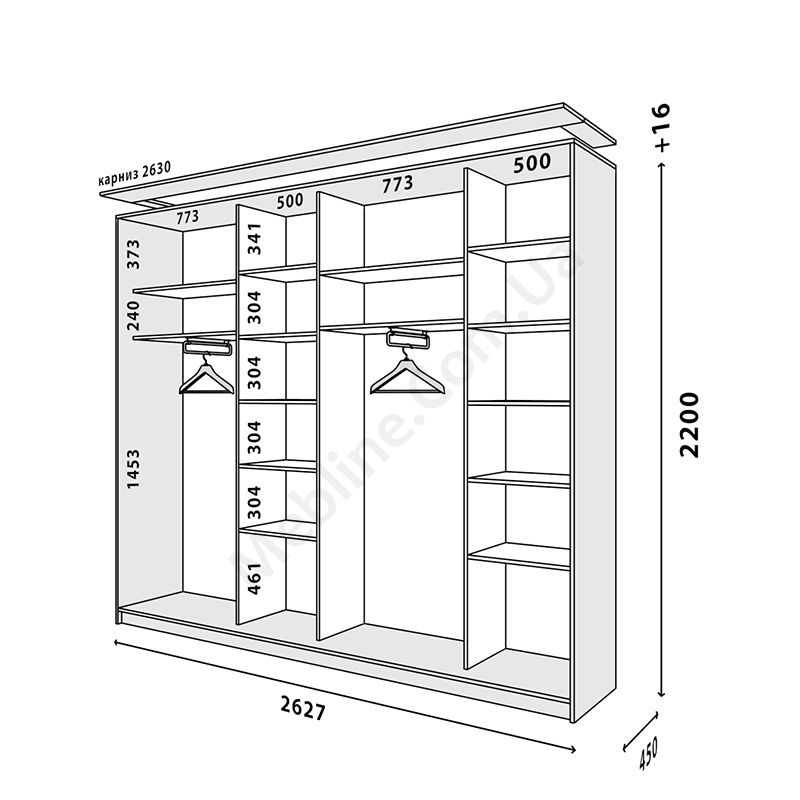 Чотиридверна шафа-купе шириною 263 см, глибиною 45 см, висотою 220 чи 240 см