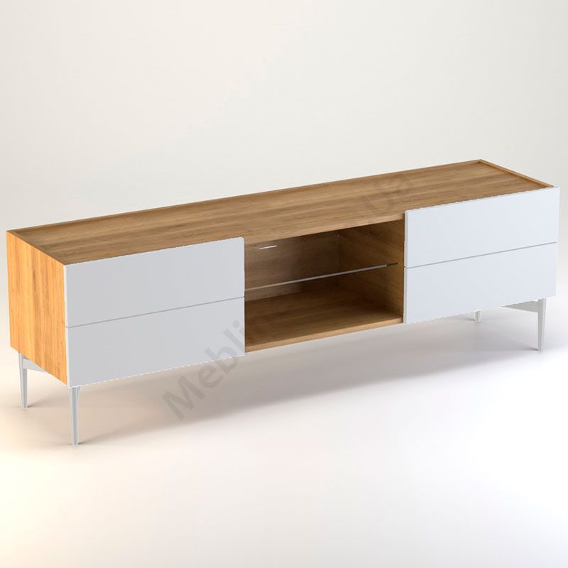 Тумба під телевізор на металевих ніжках з висувними шухлядами та відкритими полицями.
