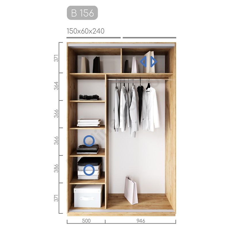 Дводверна шафа-купе шириною 150 см, глибиною 60 см, висотою 220 чи 240 см
