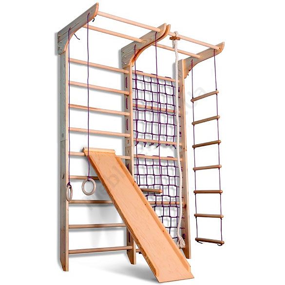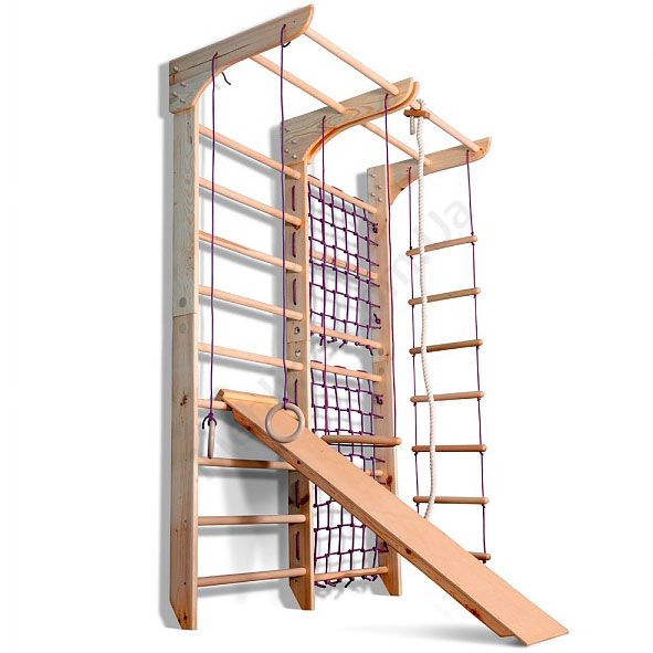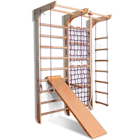 Шведська стінка з сіткою, дошкою та мотузковою драбиною.