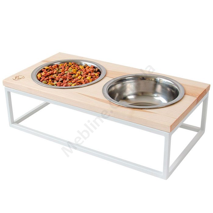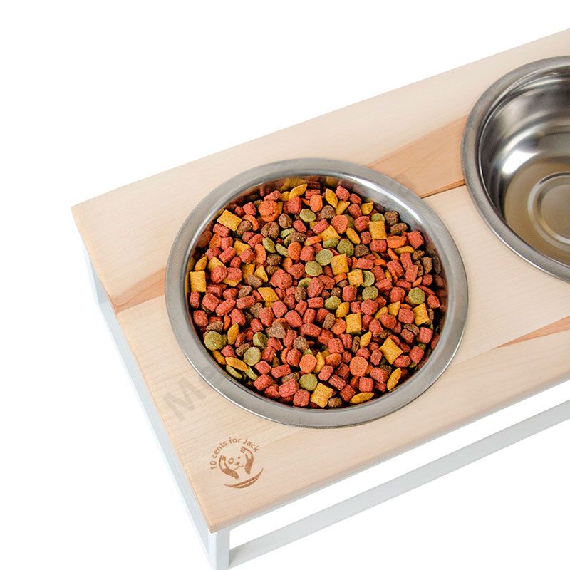 Дві металеві миски для собаки на підставці з дерев’яною стільницею.