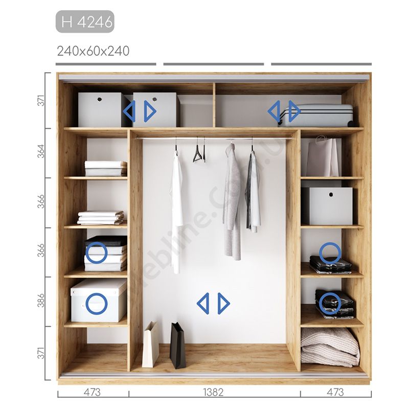 Тридверна шафа-купе шириною 240 см, глибиною 60 см, висотою 220-270 см