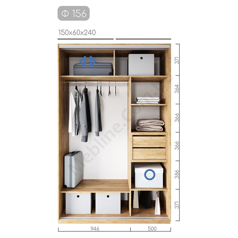Дводверна шафа-купе шириною 150 см, глибиною 60 см, висотою 220 чи 240 см