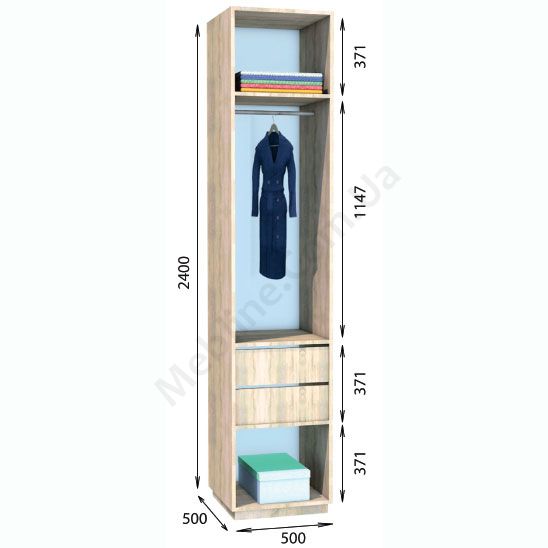 Пенал зі штангою для одягу, шухлядами та полицями.