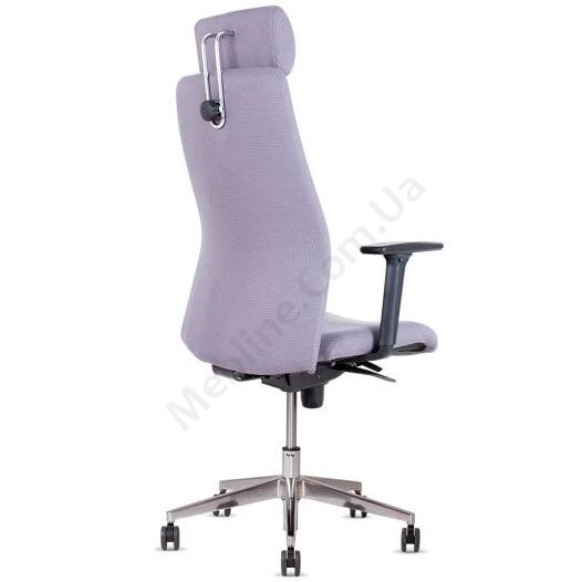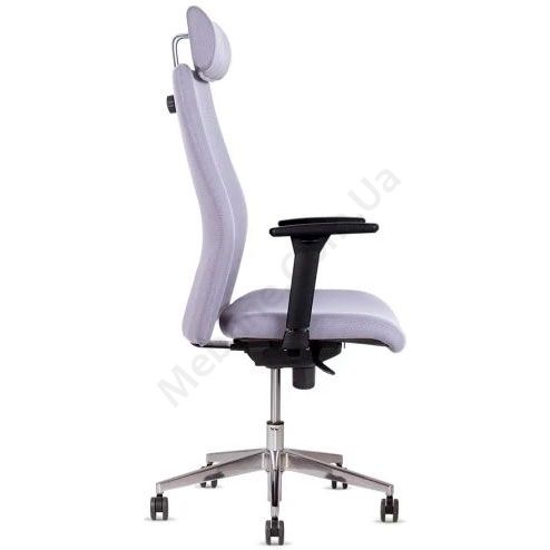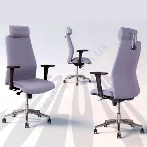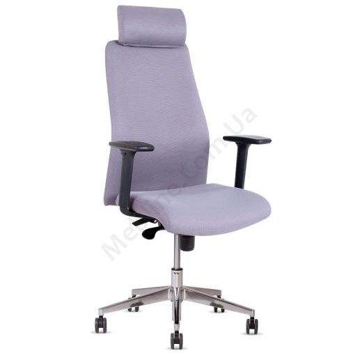 Крісло для керівника в лаконічному стилі, пластиковим регульованими підлокітниками, регульованим підголівником, фіксацією у 3 положеннях, на алюмінієвій основі.