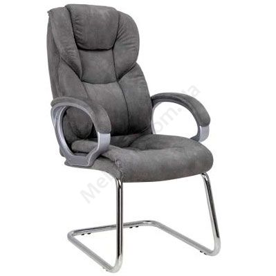Крісло для конференцій з інтегрованим підголівником, нерегульованими підлокітниками з м’якими накладками, на металевій основі.