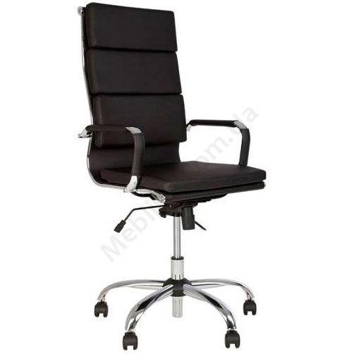 М’яке крісло для керівника з нерегульованими підлокітниками з м’якими накладками, фіксацією в будь-якому положенні, на хромованій основі.