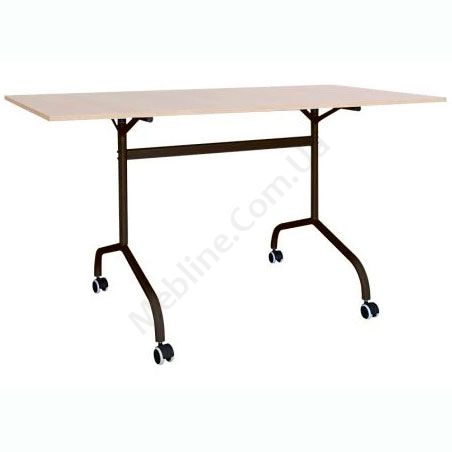 Розкладний кухонний стіл прямокутної форми на чорних металевих ніжках роликах.
