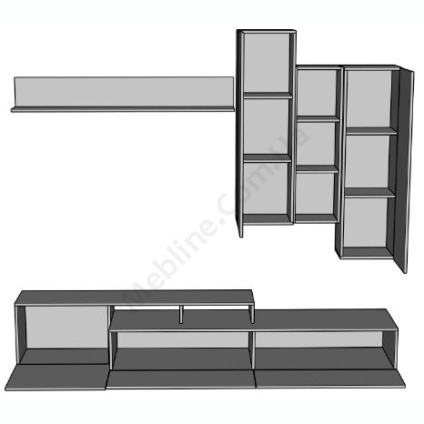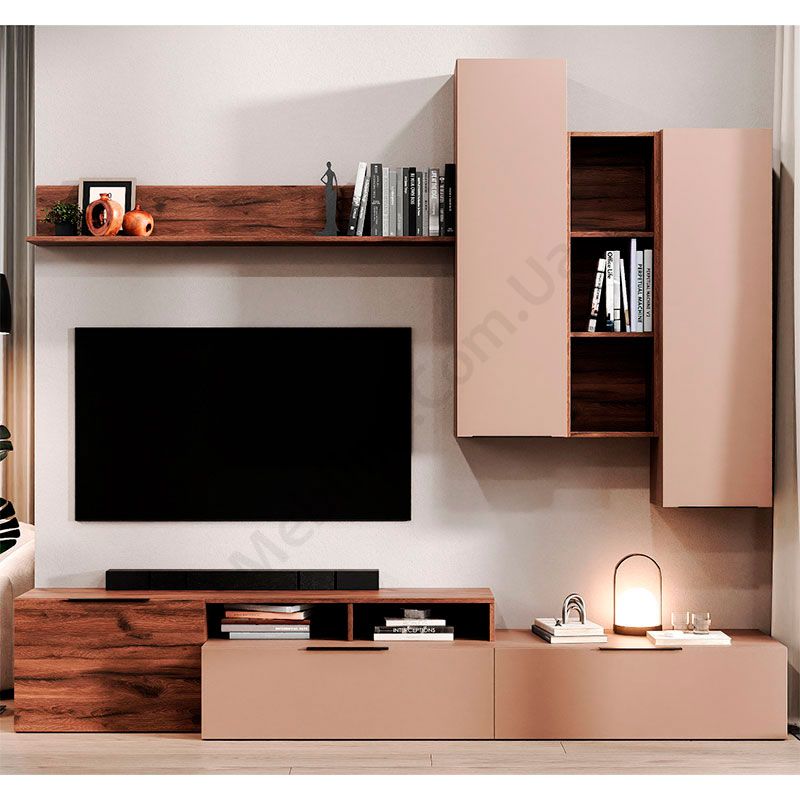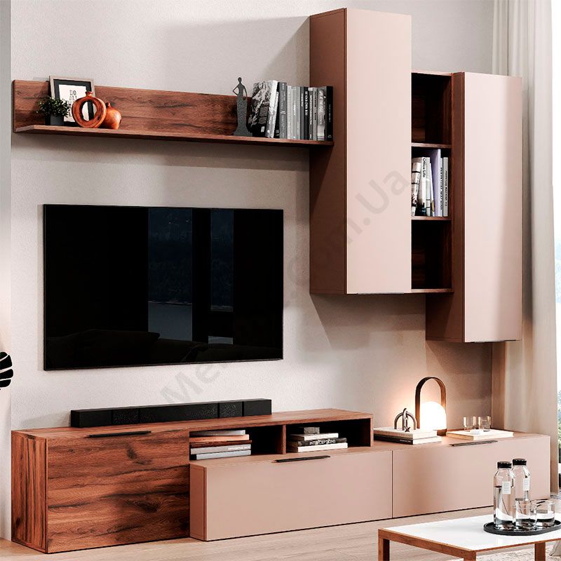 Стінка у вітальню з тумбою під телевізор, шафками та полицею.