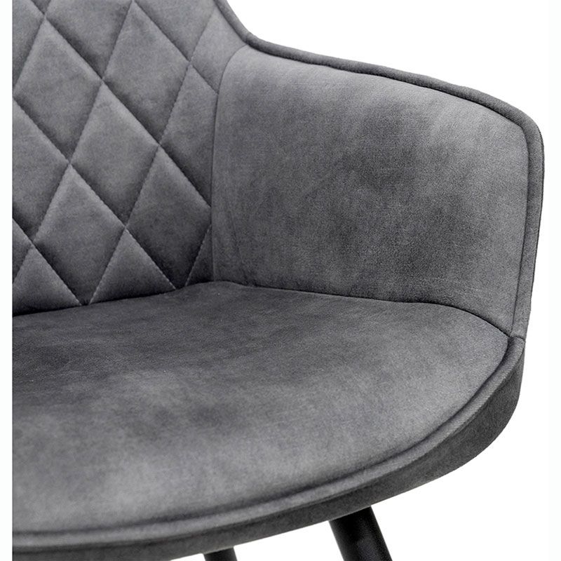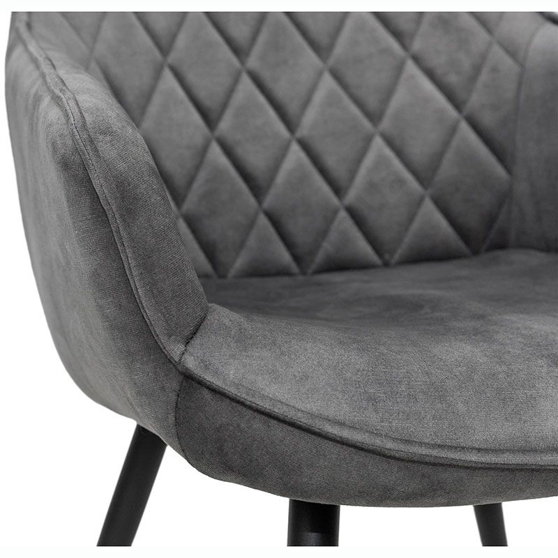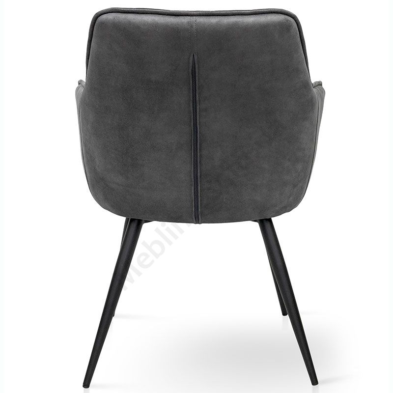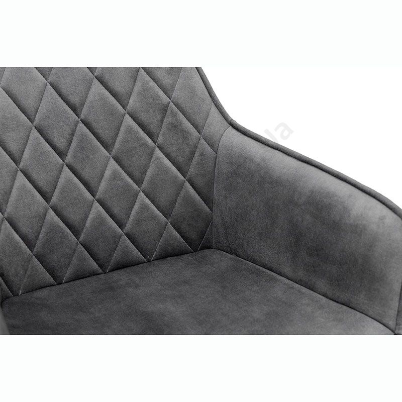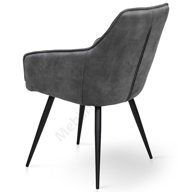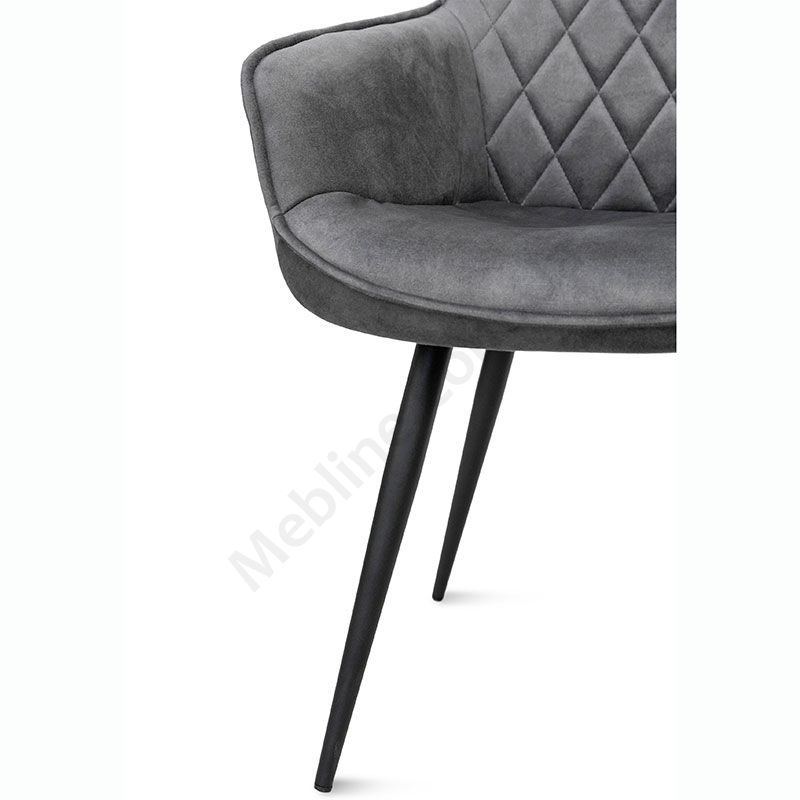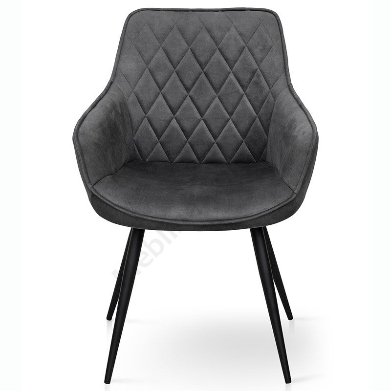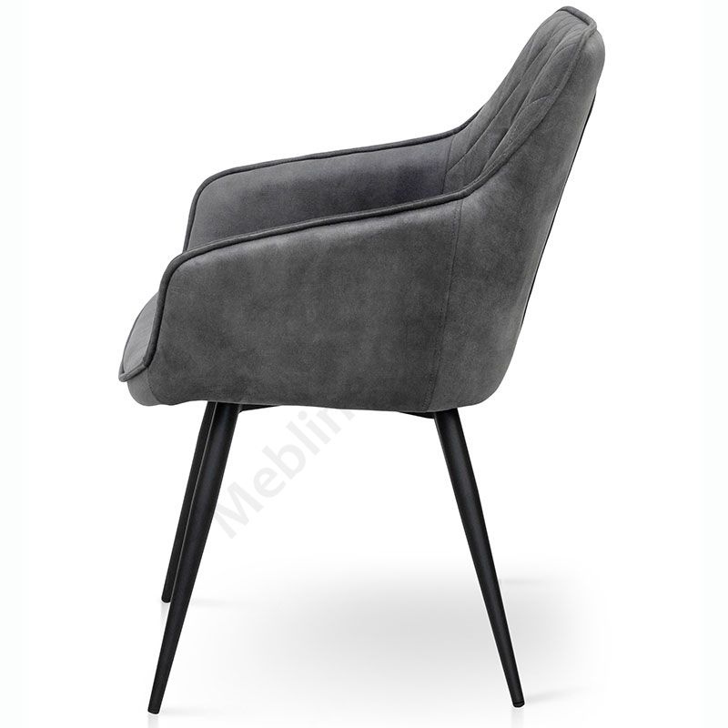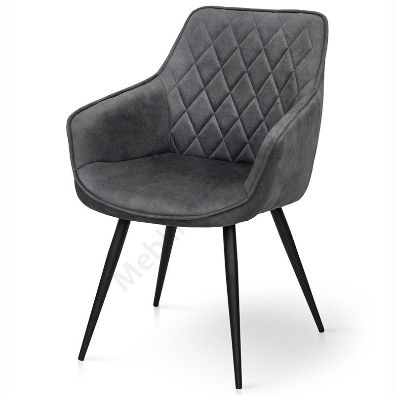 Крісло на металевих чорних ніжках із тканинною темно-сірою оббивкою.