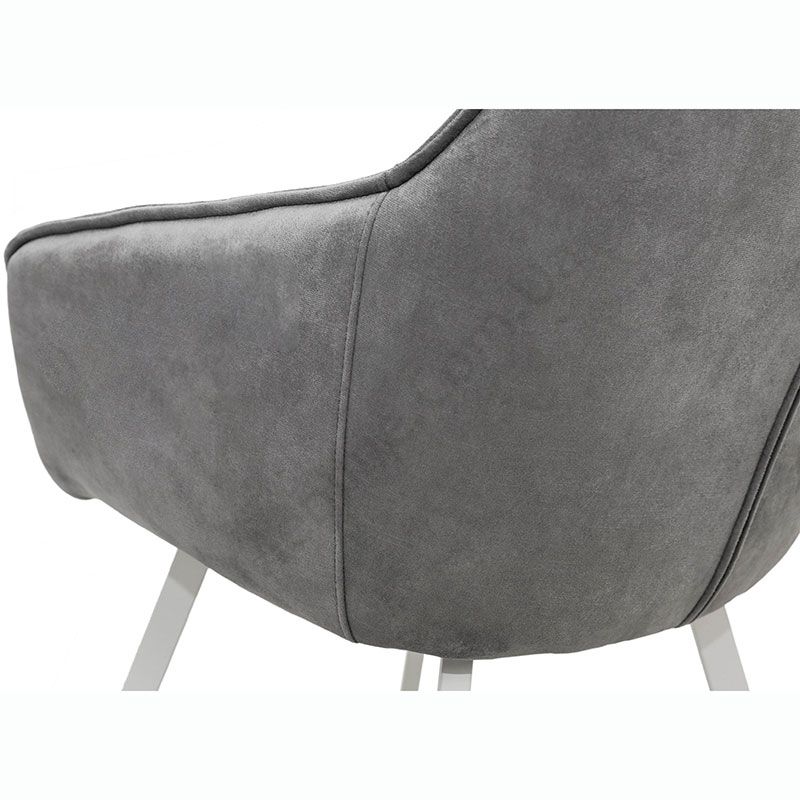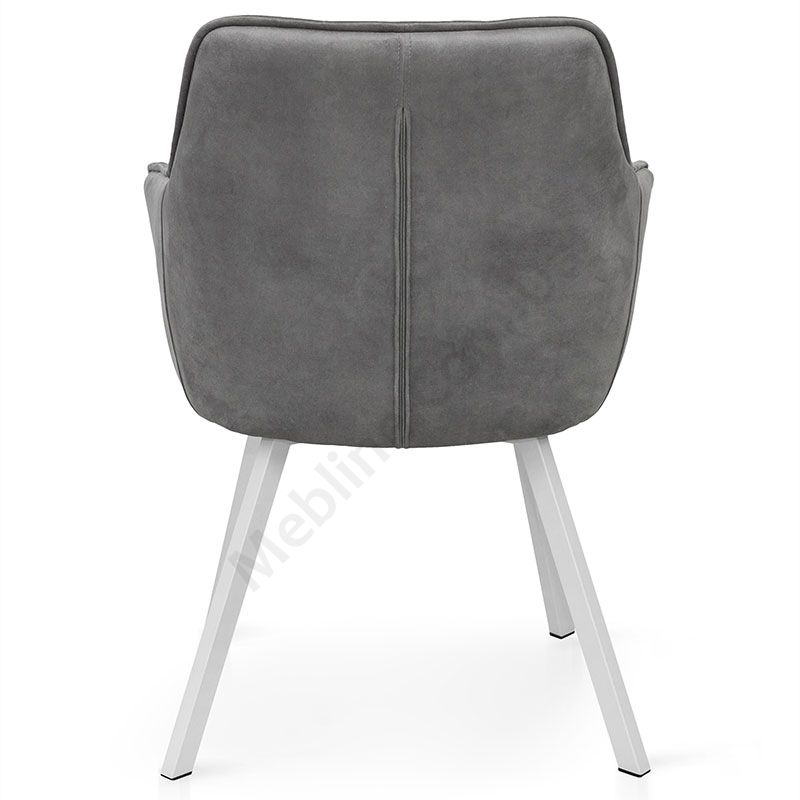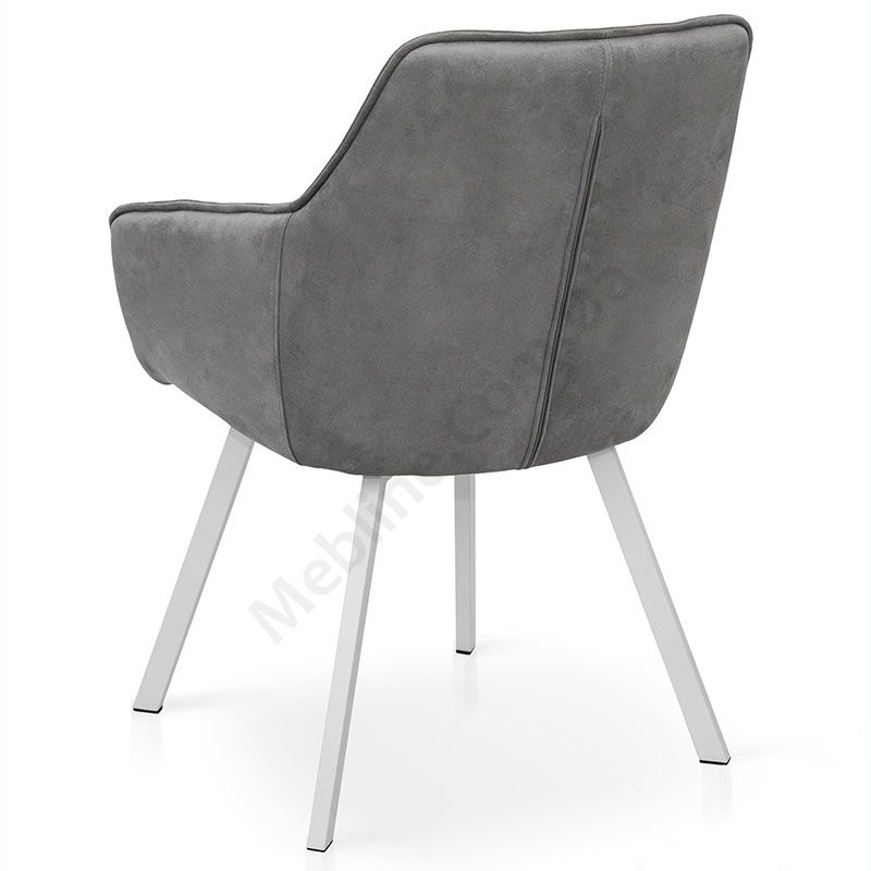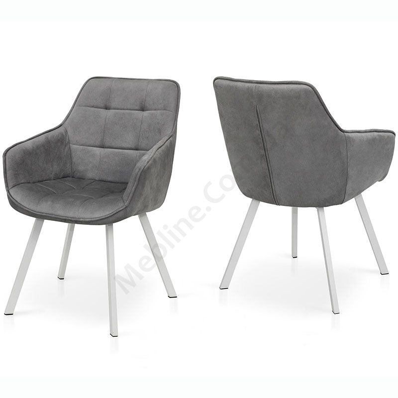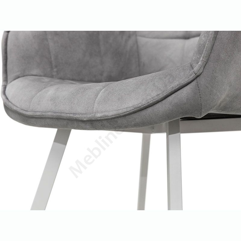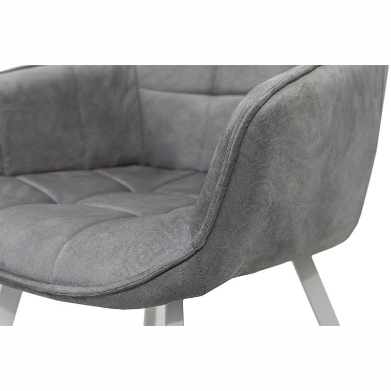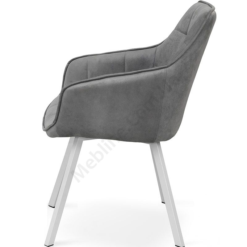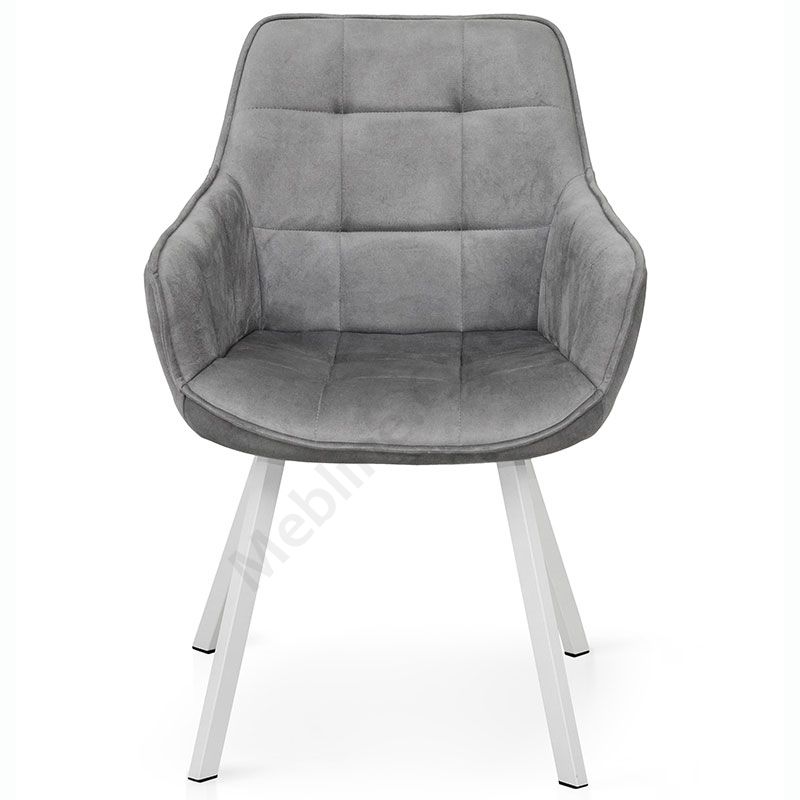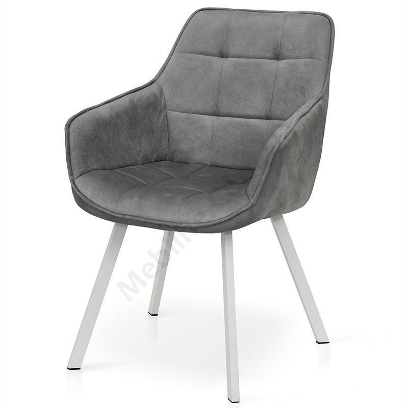 Крісло на металевих білих ніжках із тканинною світло-сірою оббивкою.
