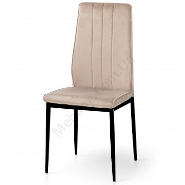 М’який стілець без підлокітників на чорних металевих ніжках з велюровою оббивкою пісочного кольору.