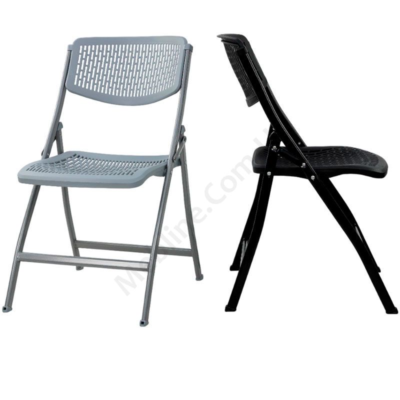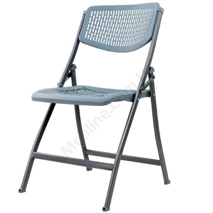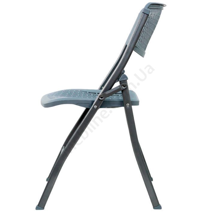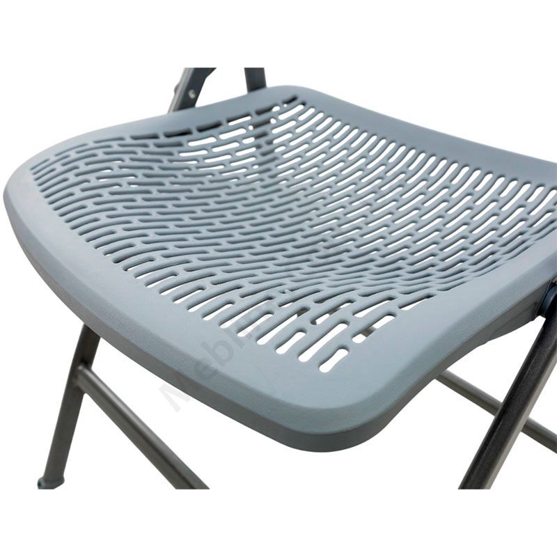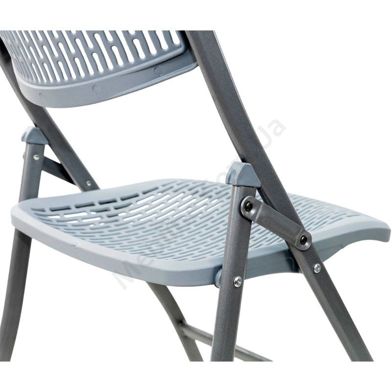 Розкладний компактний стілець із пластику на сірому металевому каркасі.