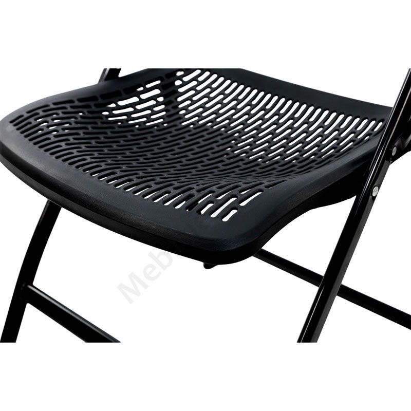 Розкладний компактний стілець із пластику на чорному металевому каркасі.