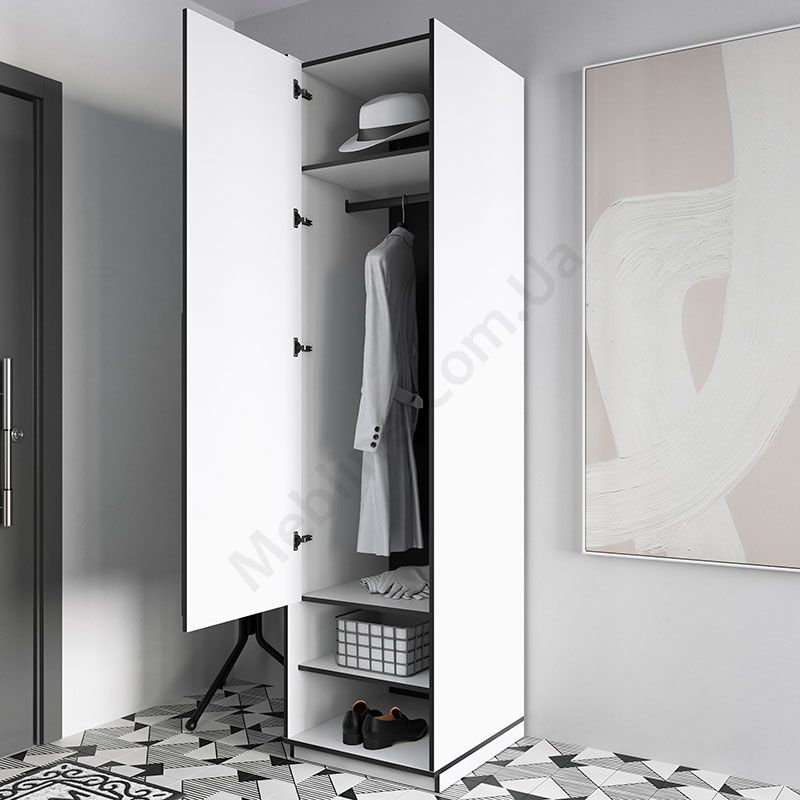 Розпашна однодверна шафа з відкритими полицями та штангою для одягу.