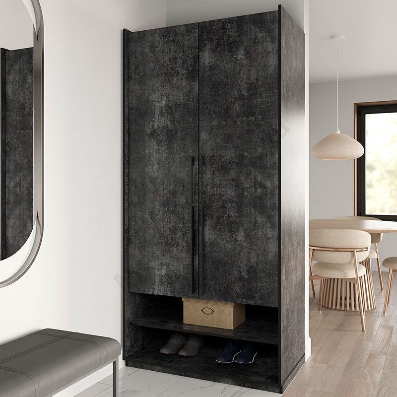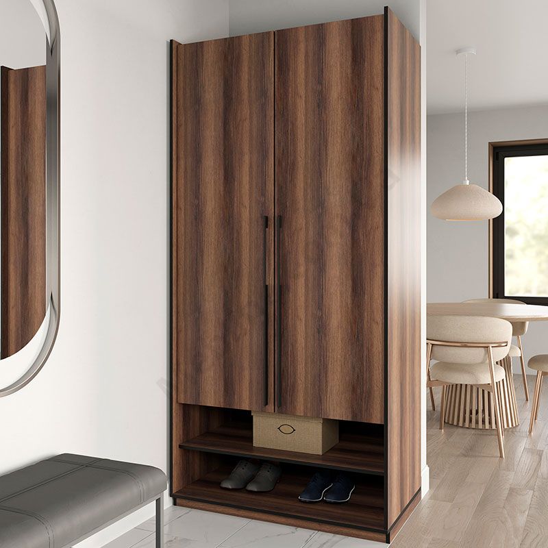 Розпашна дводверна шафа з відкритими полицями та штангою для одягу.