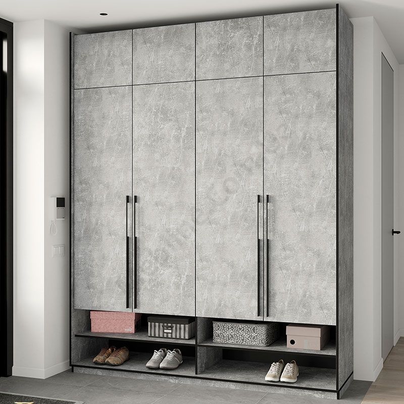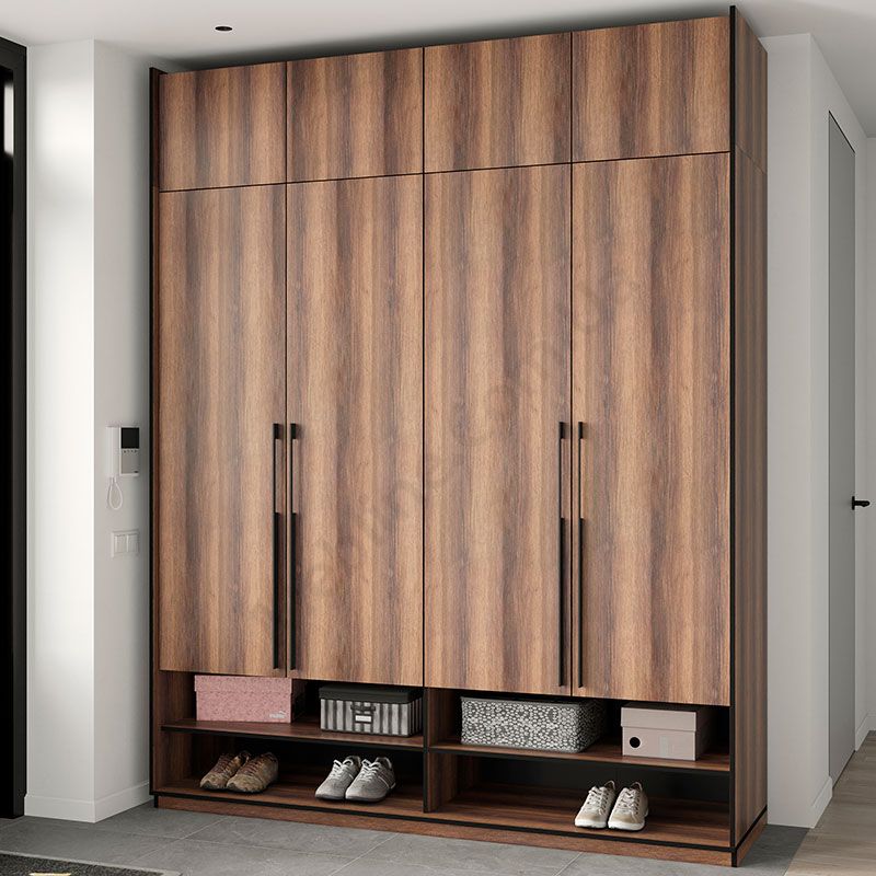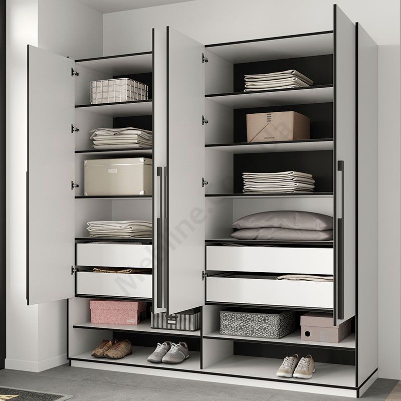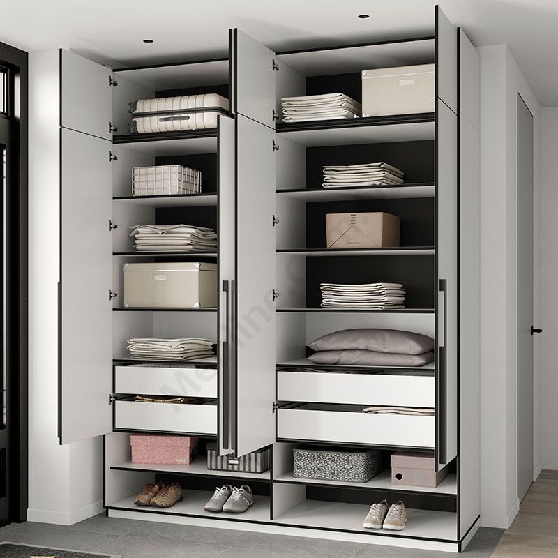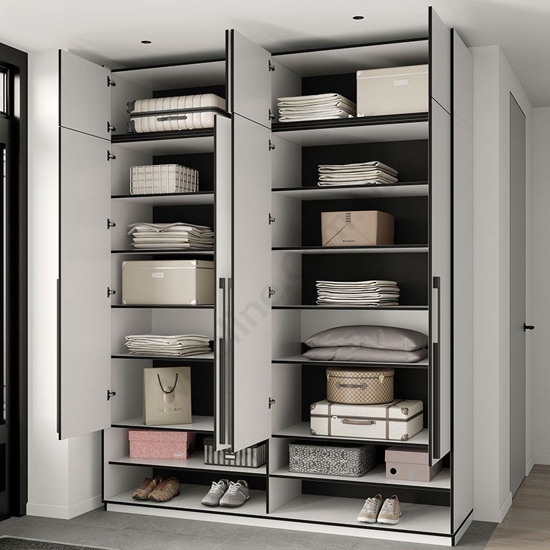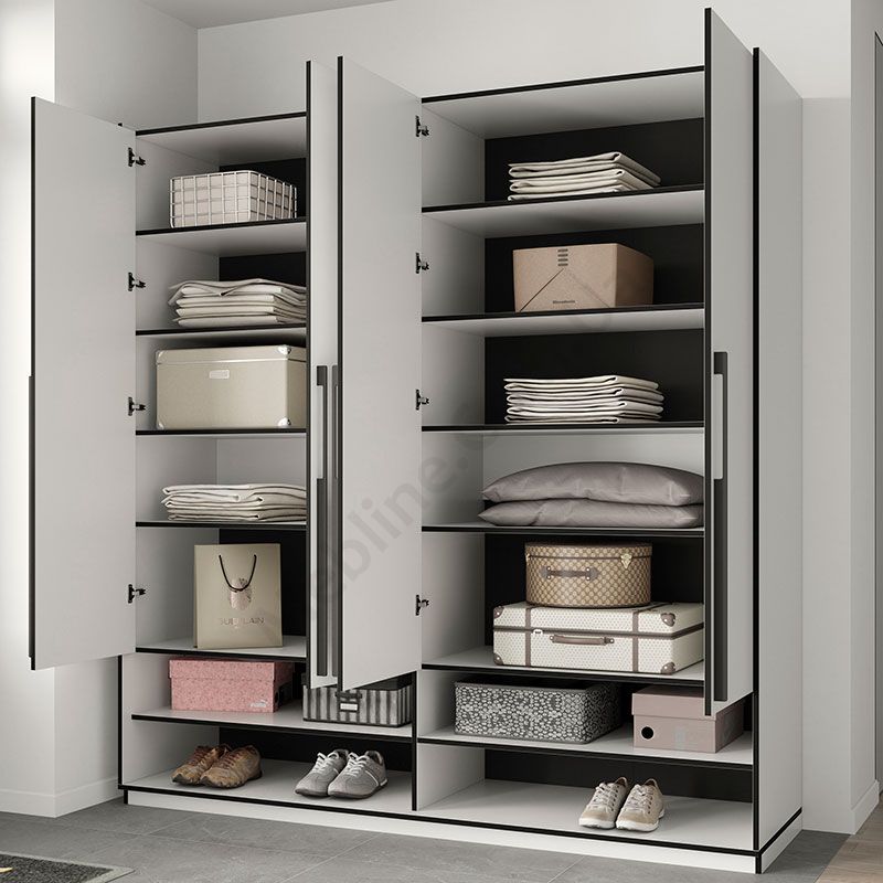 Розпашна чотиридверна шафа з відкритими та закритими полицями.