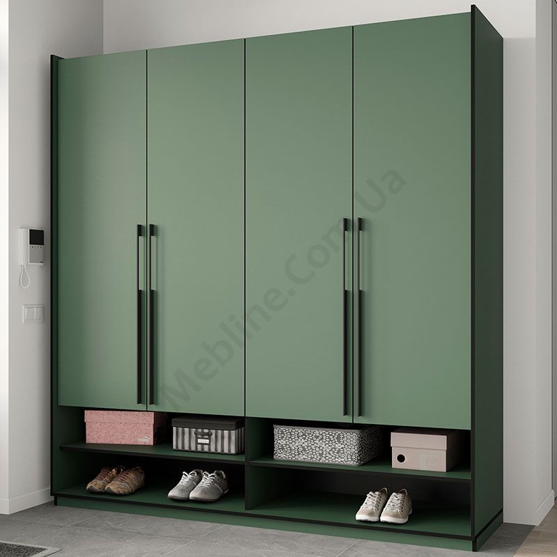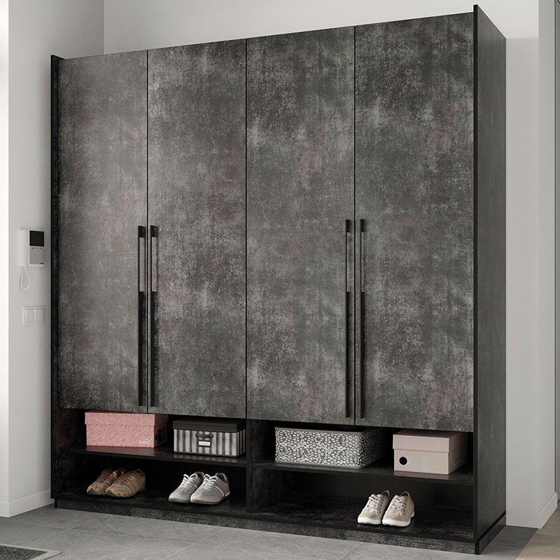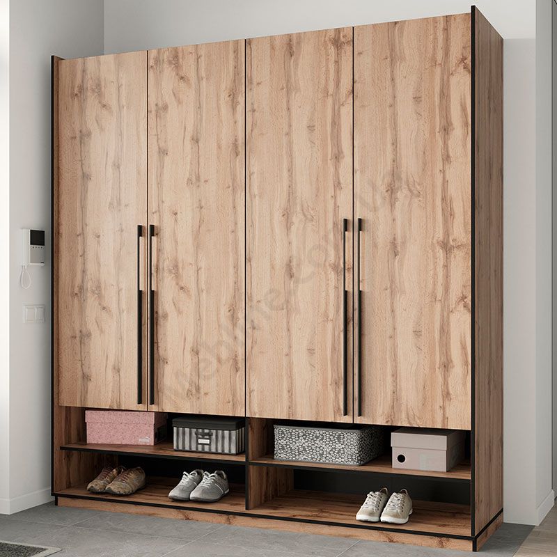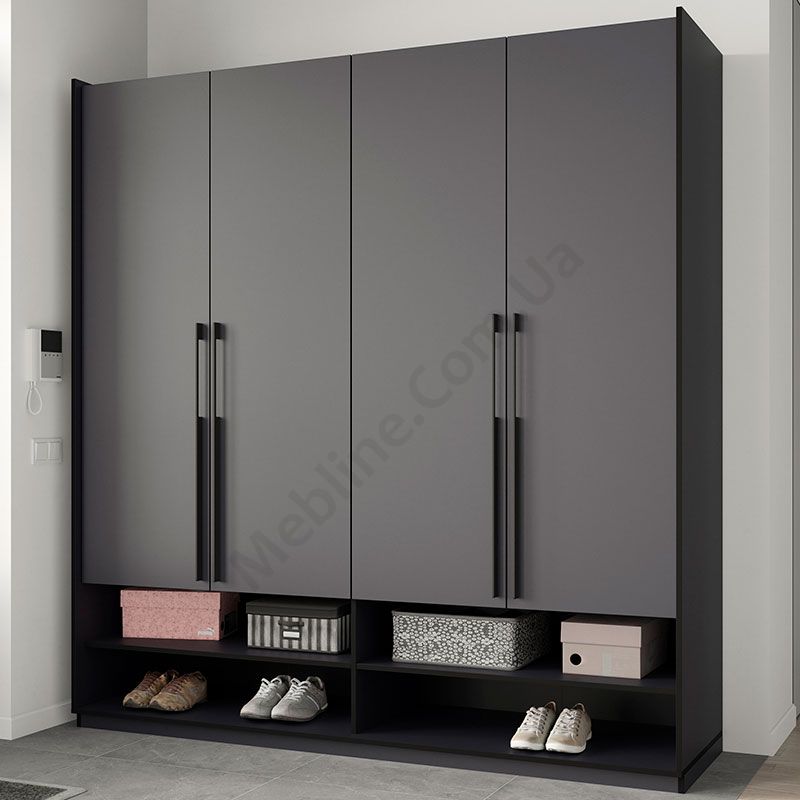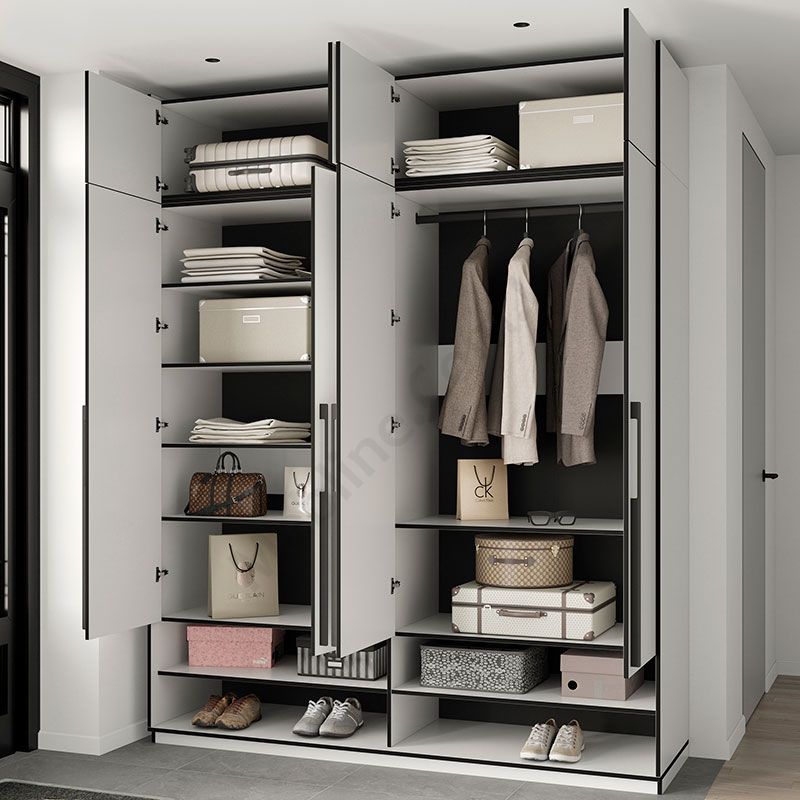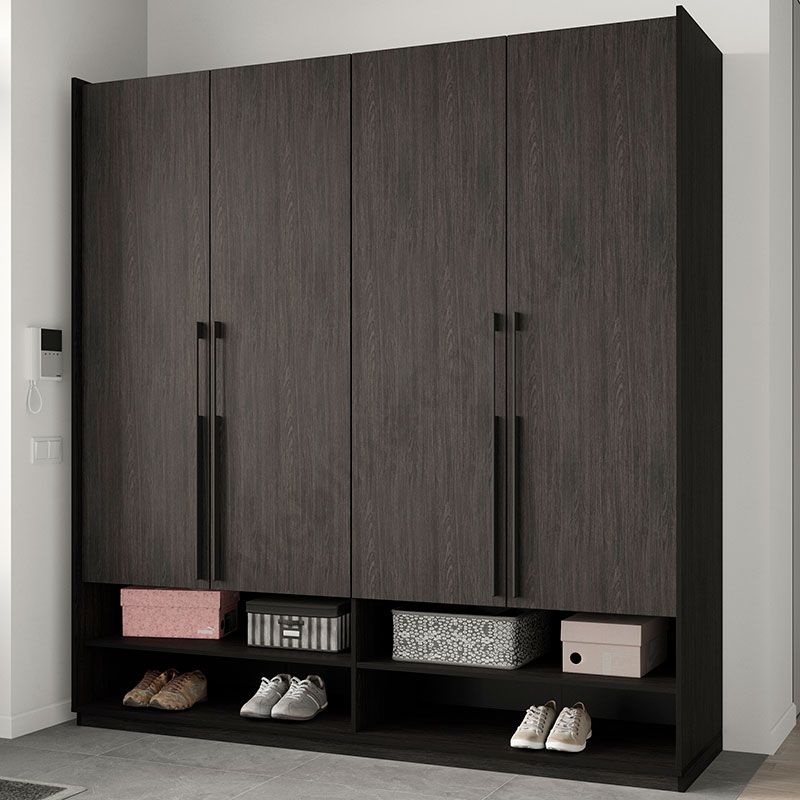 Розпашна чотиридверна шафа з відкритими та закритими полицями і штангою для одягу.