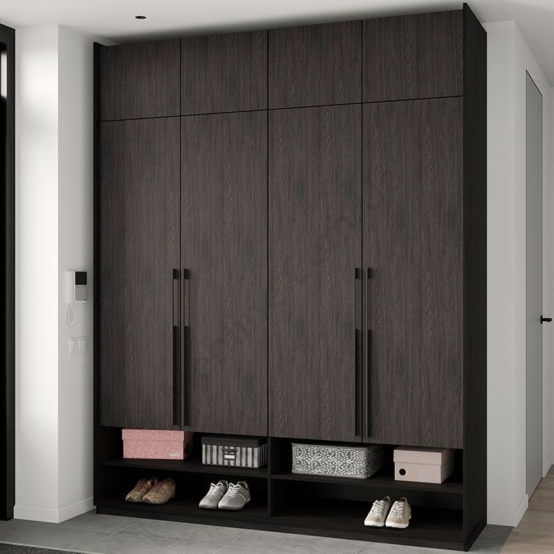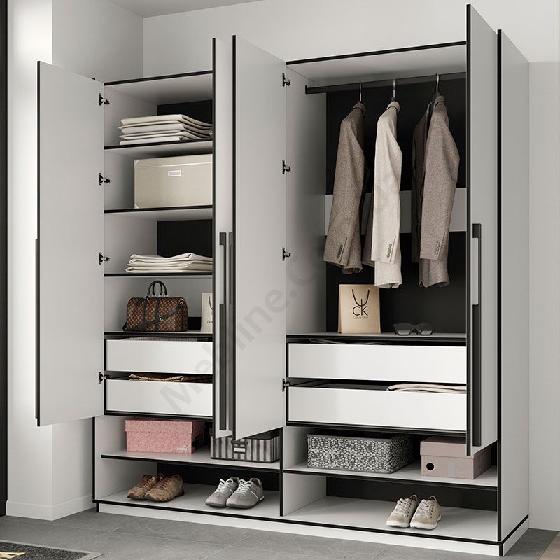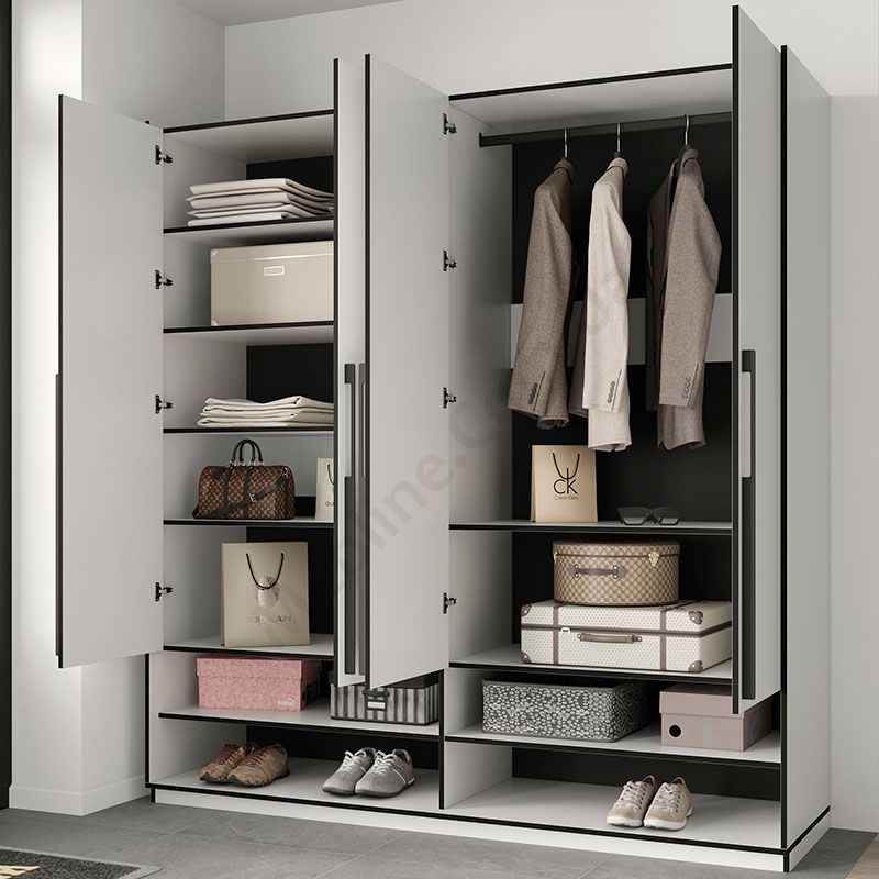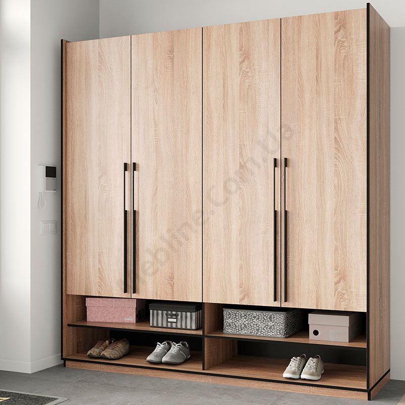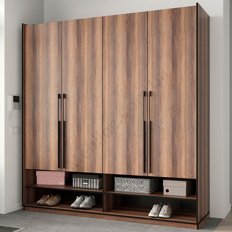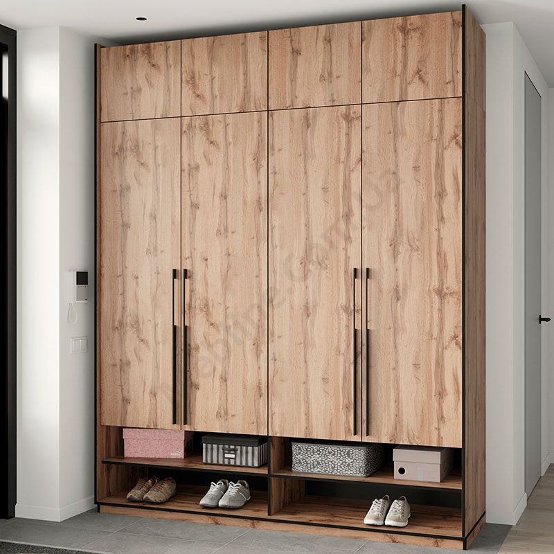 Розпашна чотиридверна шафа з відкритими та закритими полицями і штангою для одягу.