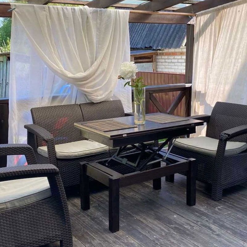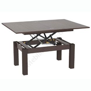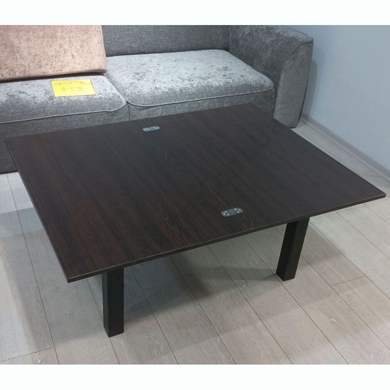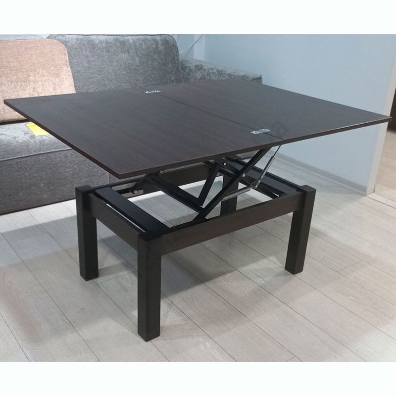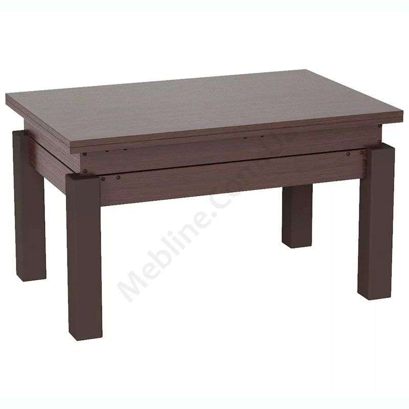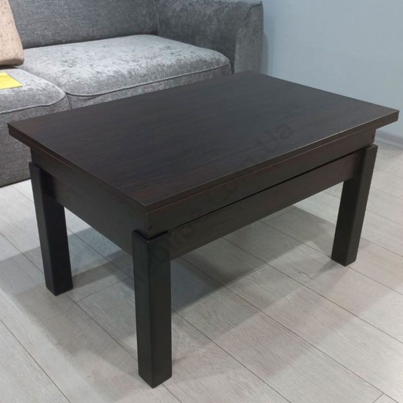 Журнальний стіл на дерев’яних ніжках венге, який трансформується в обідній з ДСП стільницею кольору венге.