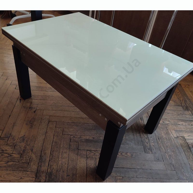 Журнальний стіл на дерев’яних ніжках, який трансформується в обідній, зі скляною стільницею білого кольору.