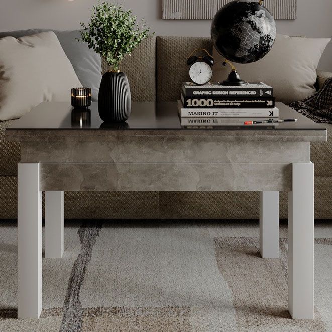 Журнальний стіл на дерев’яних ніжках, який трансформується в обідній зі скляною стільницею кольору графіт.